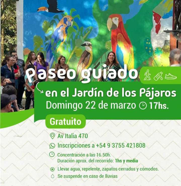 El domingo 22 de marzo, la Dirección de Turismo, Recreación y Cultura de Oberá organiza un recorrido a pie por el Jardín de los Pájaros, uno de los espacios verdes más reconocidos de la ciudad.